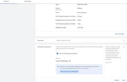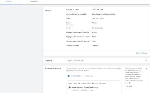 Click into your previously set-up Form Submit conversion event, and down the bottom of the page, there will be an Enhanced Conversions tab. Expand the tab, and tick Turn on enhanced conversions.