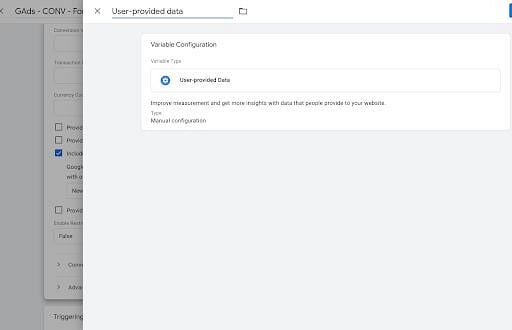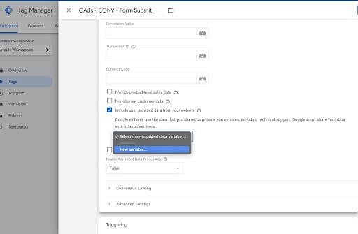 Open your Google Ads form submission conversion tag. Tick include user-provided data from your website.