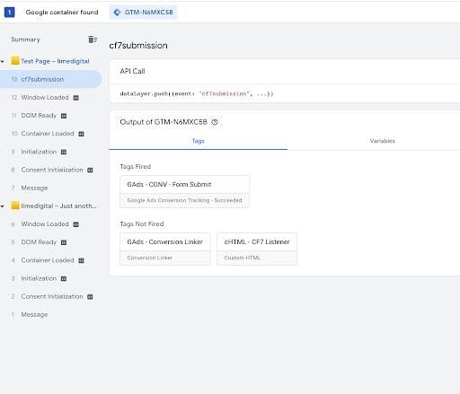 Navigate back to Google Tag Manager, and we should see a formSubmission event being fired, or whatever you have named the custom event to fire on a form submission trigger, where our Google Ads conversion tag was also fired.