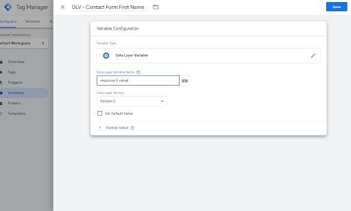 Create a Last Name DLV, and for Data Layer Variable name let’s input response.1.value