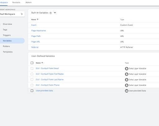 Each variable name represents our form fields, and the data we input is correctly being pulled through as values for our Data Layer variables.