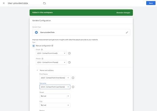 This will give you access to a box for a user-provided data variable. Create the new variable. Select Manual configuration. You will see here several fields for user data, including Phone, Email, Name, and Address. Depending on your form complexity, we can populate whichever fields can be matched. For now, leave this variable empty and click Save. We’ll come back here once we have the data to input.