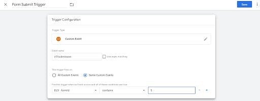 Now you can modify the formSubmission trigger, and change to Some Custom events, selecting the formId, and entering the value for your selected form.