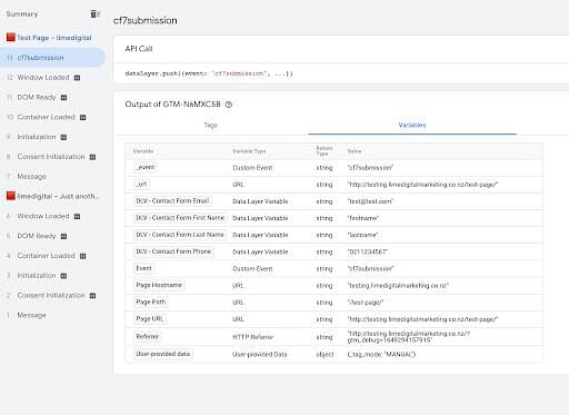 Each variable name represents our form fields, and the data we input is correctly being pulled through as values for our Data Layer variables.